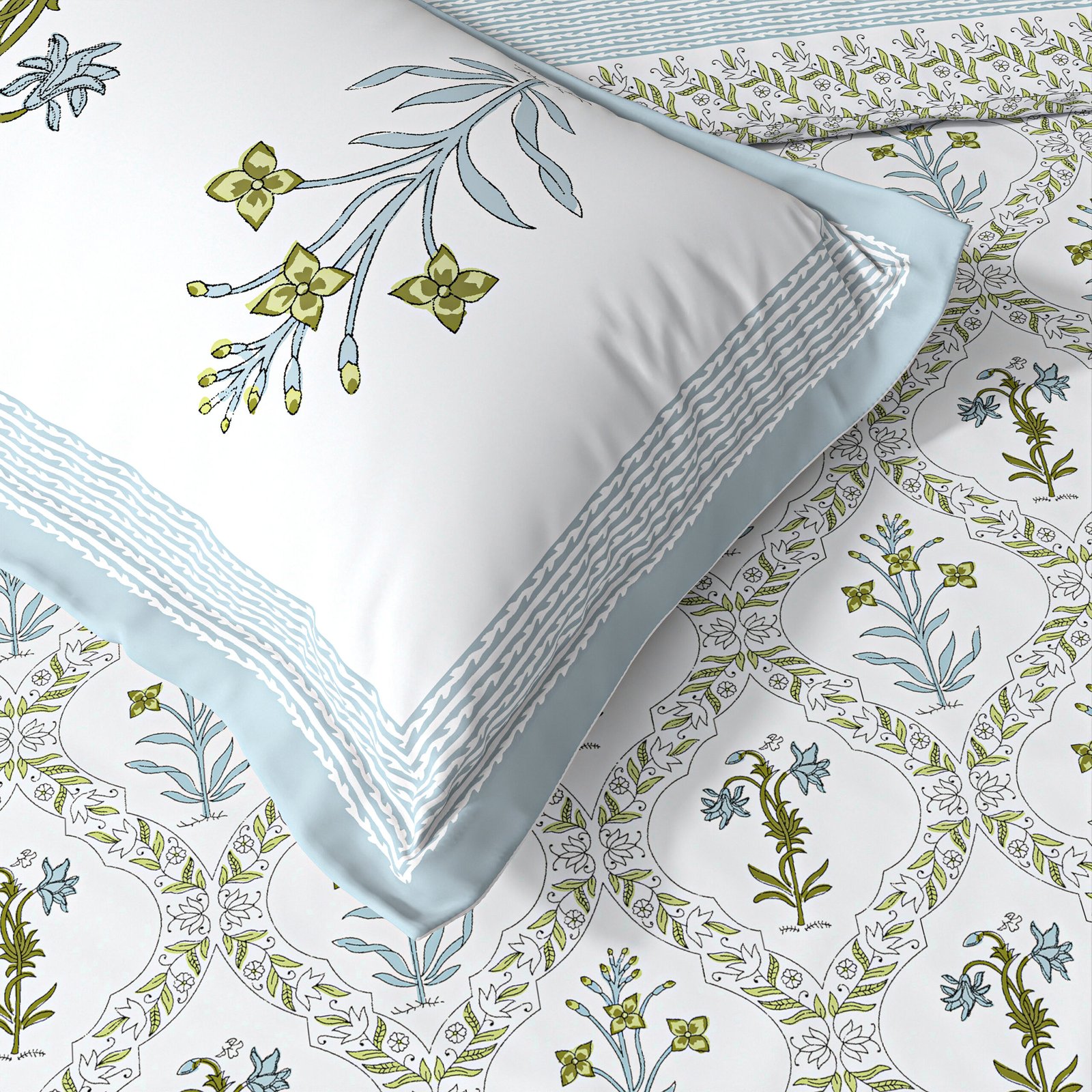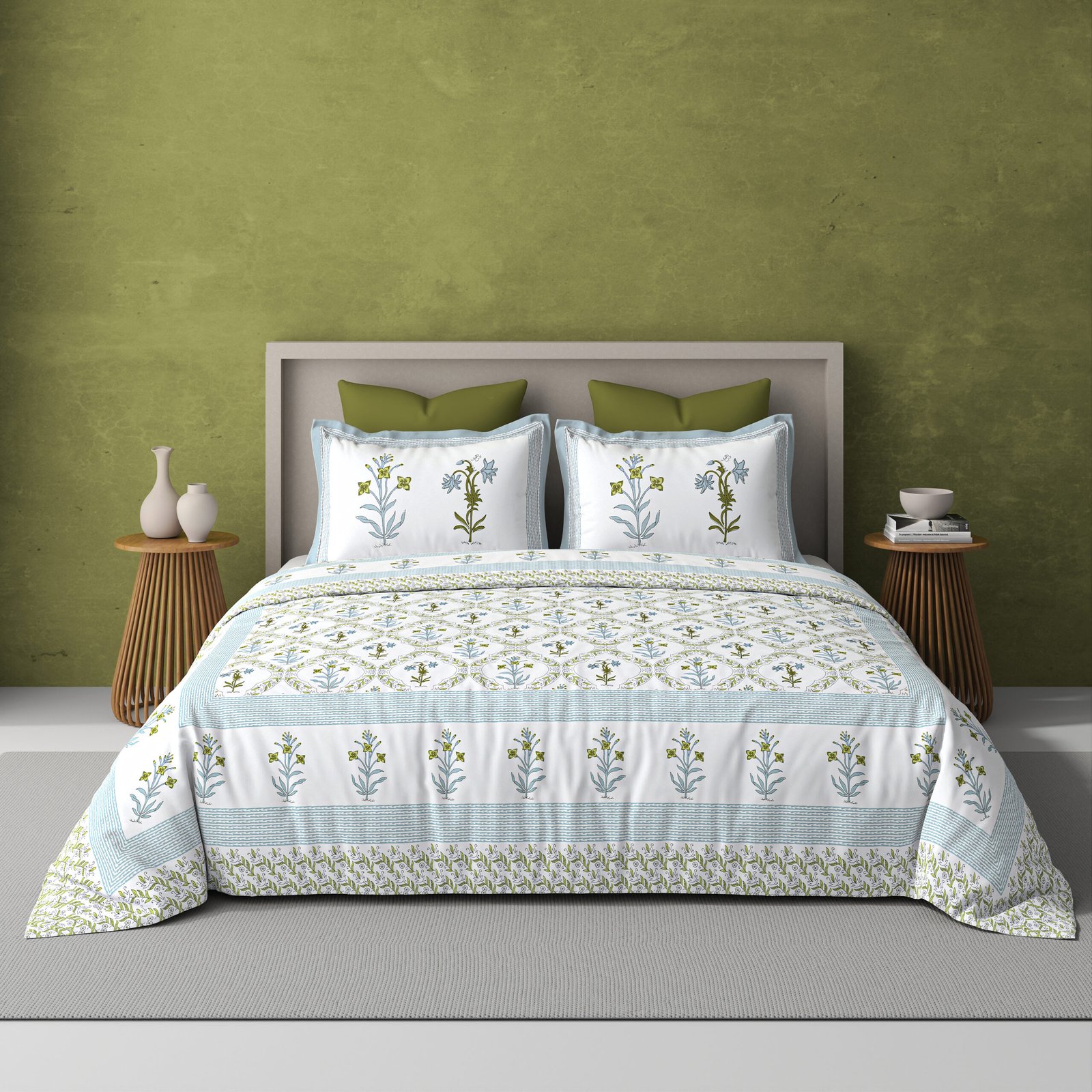 Blooming lily-300 TC premium percale weave.100% cotton, block print, super king size bedsheet set. Mint Green