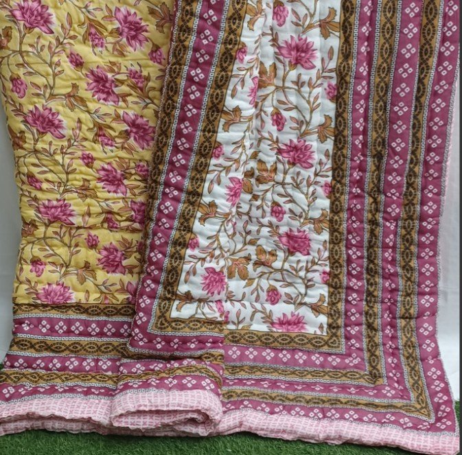 Pure Cotton Double Bed 90×100 Inch.Soft Jaipuri AC Quilt/Razai/Comforter Floral Print Yellow.