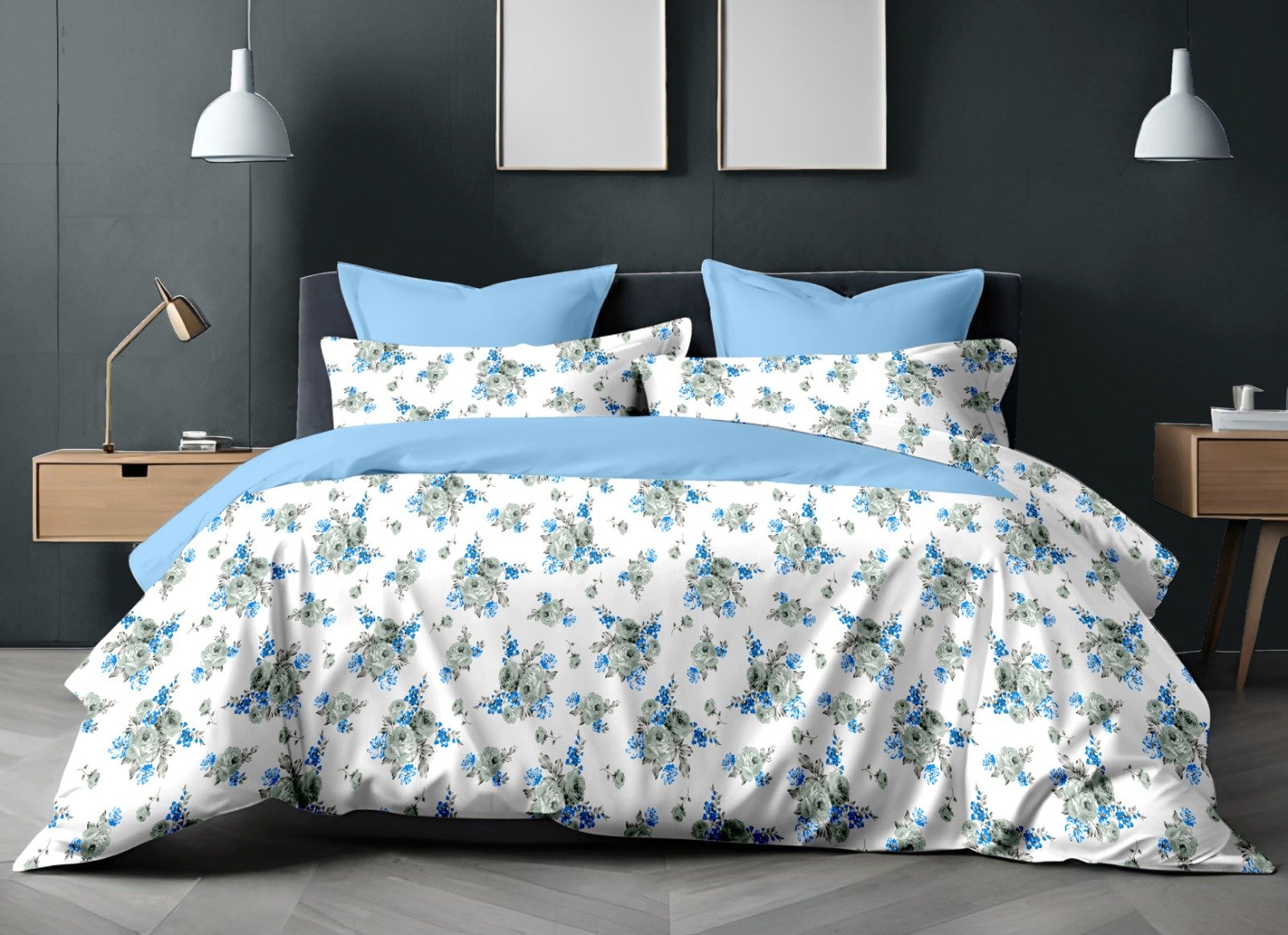 Zinnia 250 TC 100% Cotton Printed Queen Size Bedsheet With 2 Pillow Covers,Blue.